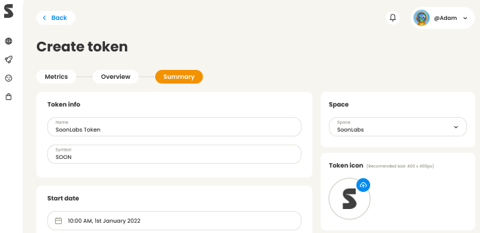 Los espacios podrán crear tokens y hacer subidas públicas en Soonaverse. En cuanto a los tokens, cualquiera puede entrar en su espacio y crear un token. Para crear un token, el guardián del espacio tendrá que rellenar información que incluya el nombre, el símbolo, el icono, el suministro total, los porcentajes de asignación, etc.