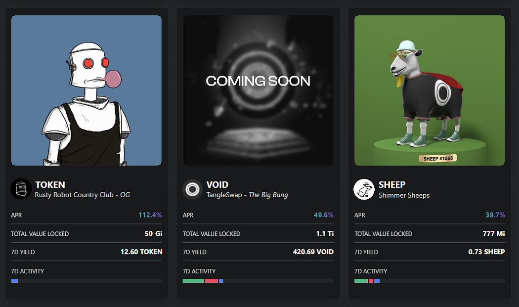 Además de los ya conocidos servicios que puede propocionar un exchange como intercambios entre monedas, pools de Liquidez, farming, staking – TangleSwap también podrá bloquear algunos de sus NFTs en pools únicos que generarán pasivamente APY (Annual % Yield) en tokens $VOID (propios de TangleSwap) u otros tokens IOTA nativos.